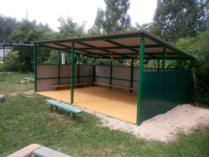 - Каркас — Профильная труба различного сечения: Колонны труба 80х80, обрешетка и связи из профильной трубы 60х60 и 60х40. Кровля — крашеный профлист любого цвета по желанию заказчика